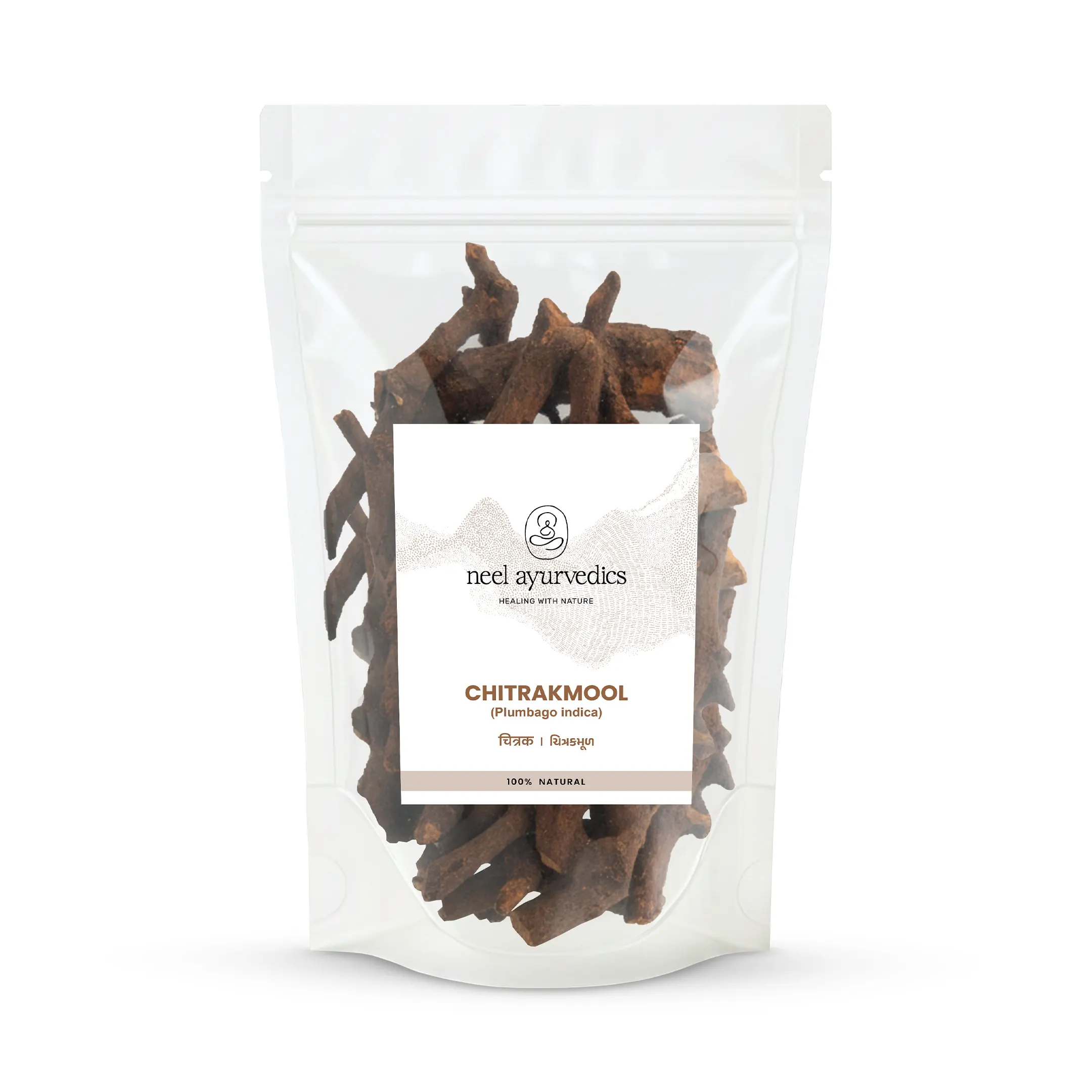 Neel Ayurvedics Chitrakmool, also called Doctor Bush or Ceylon Leadwort, is a powerful Ayurvedic herb cherished for centuries in traditional Indian medicine. Known for its deep detoxifying and digestive-enhancing properties, it helps to improve gut health, reduce fat accumulation, and maintain healthy cholesterol levels.