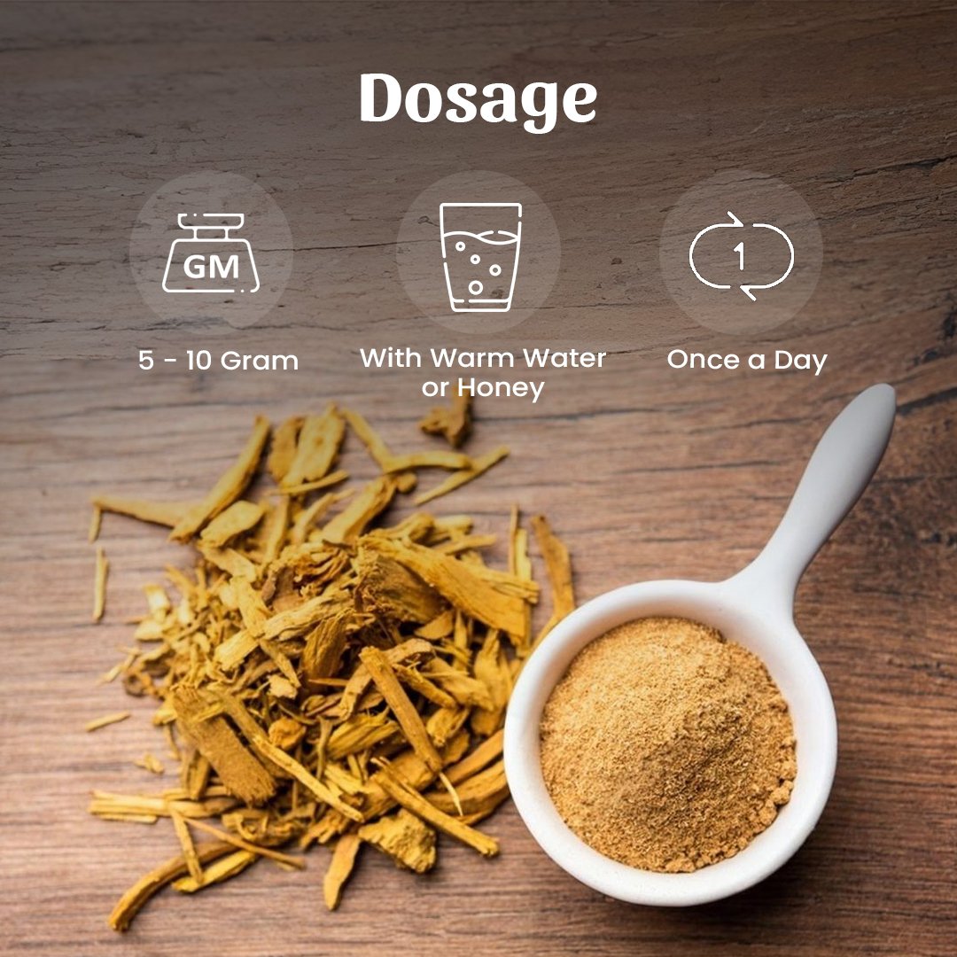 Take ¼ to ½ teaspoon of the powder mixed with lukewarm water or honey, twice a day, or as advised by your Ayurvedic practitioner. Consistent use gives the best results.