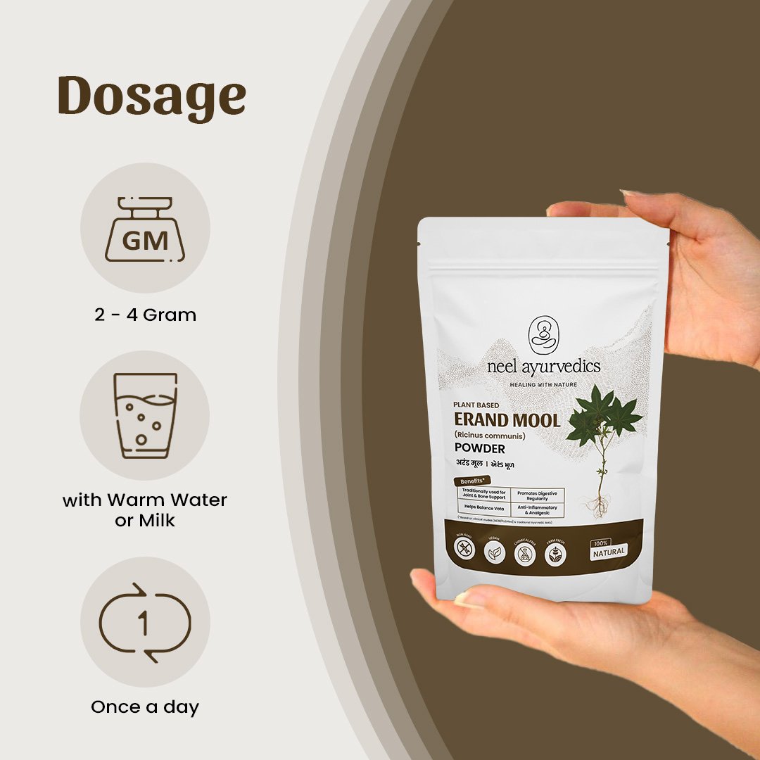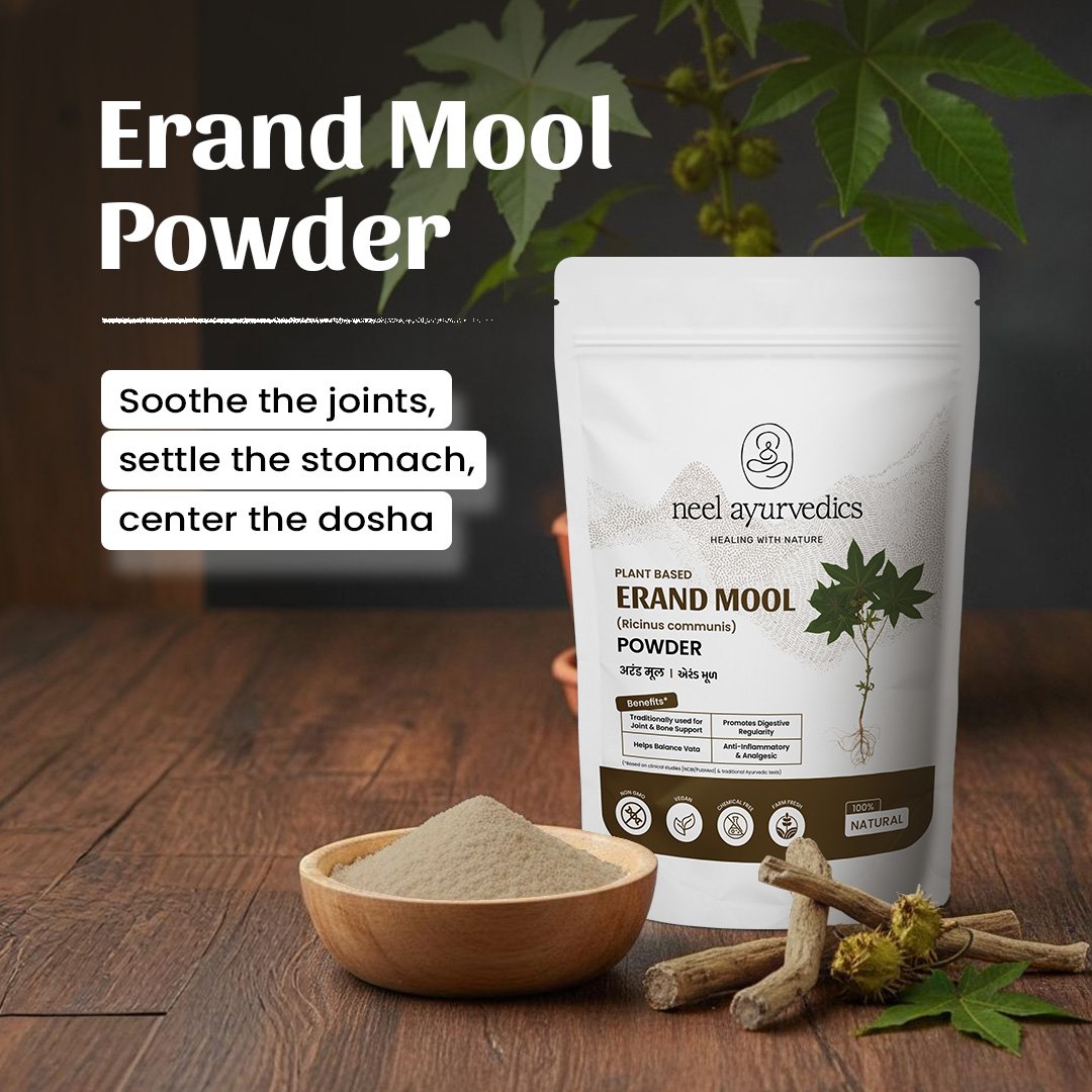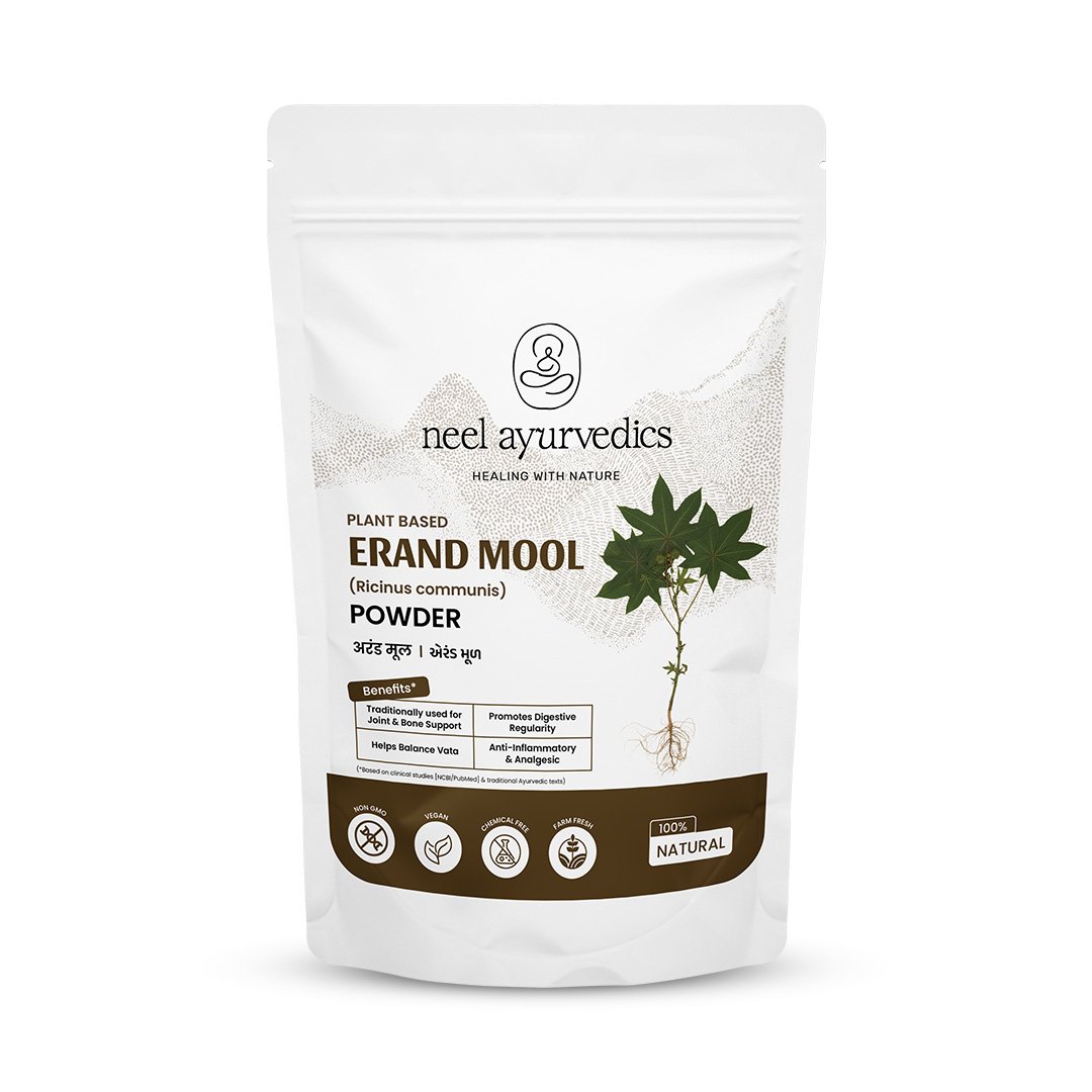 Neel Ayurvedics Erandmool Powder is an Ayurvedic herbal remedy made from castor root. It is traditionally used to relieve back pain, sciatica, and joint stiffness. It also helps support women’s health during menstruation, promotes lactation in mothers, and improves digestion naturally.
