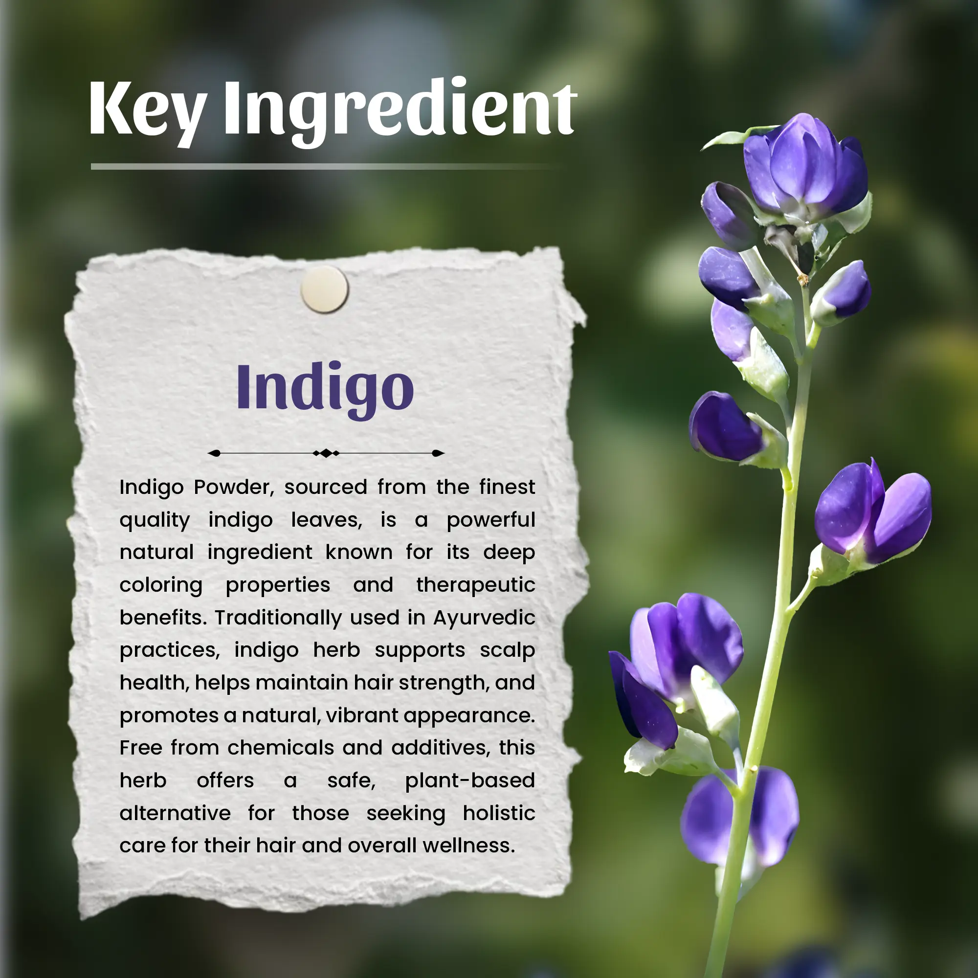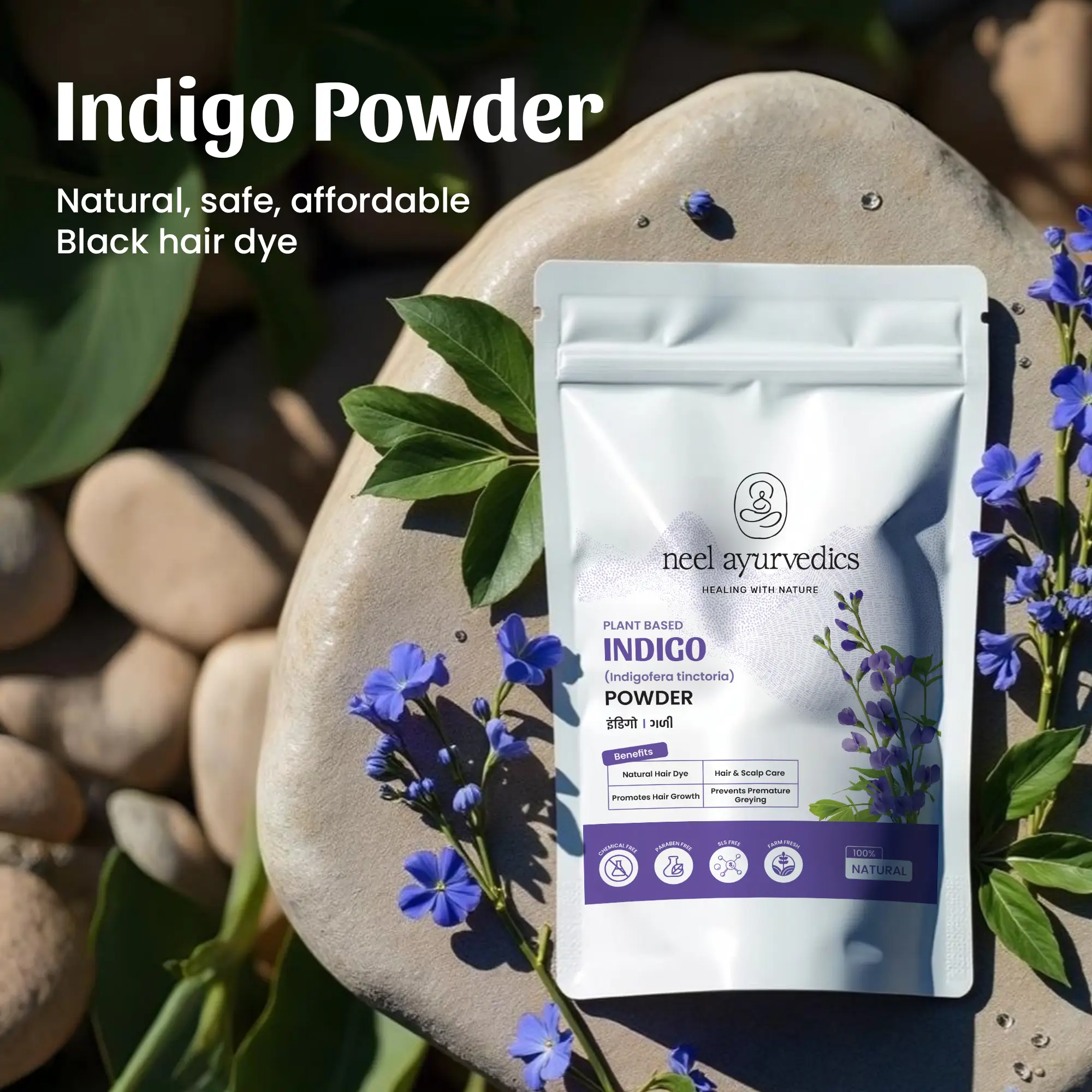 Neel Ayurvedics Indigo Powder is a natural and safe alternative to chemical hair dyes, made from 100% pure Indigofera tinctoria leaves. Traditionally used in Ayurvedic hair care, this herbal powder gives your hair a rich blue-black tint while nourishing your scalp and strengthening the roots.