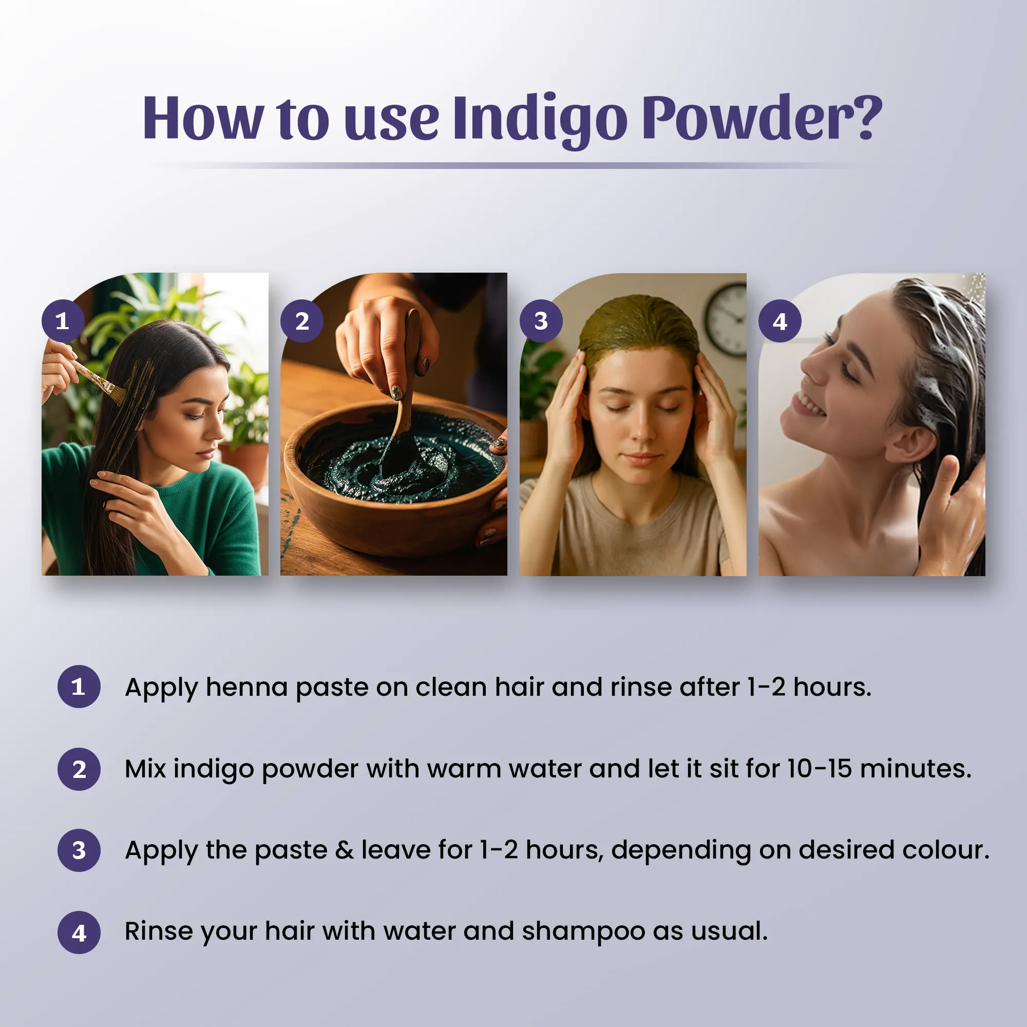- Mix Neel Ayurvedics Indigo Powder with warm water to form a smooth paste