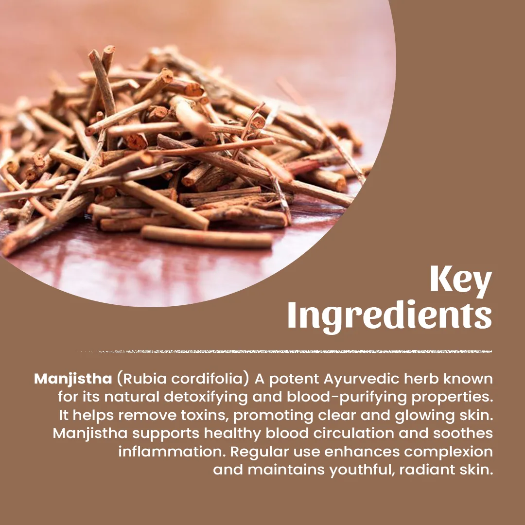 - Promotes Clear, Glowing Skin :Manjistha is widely known in Ayurveda for its ability to naturally reduce blemishes, dark spots, and uneven skin tone. It helps cleanse the skin from within, leaving you with a healthy, radiant glow.