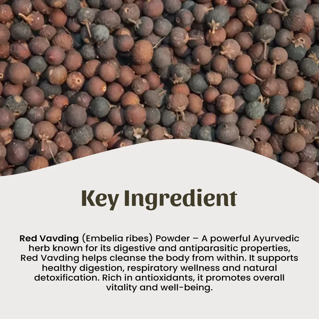 Red Vavding (Embelia Ribes) is an Ayurvedic herb that promotes digestion, boosts immunity, and increases energy. It’s a natural wellness solution used for centuries to support overall health.