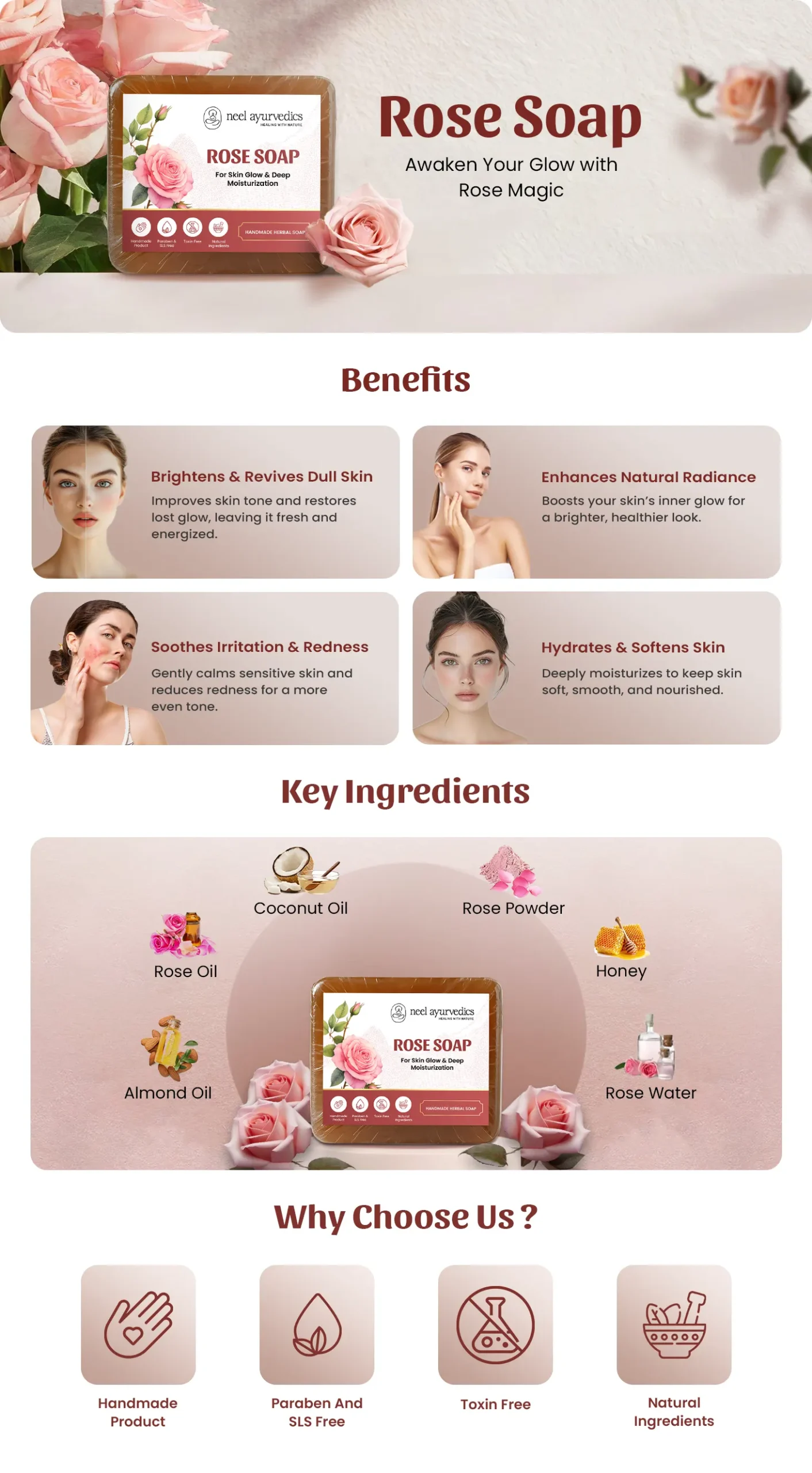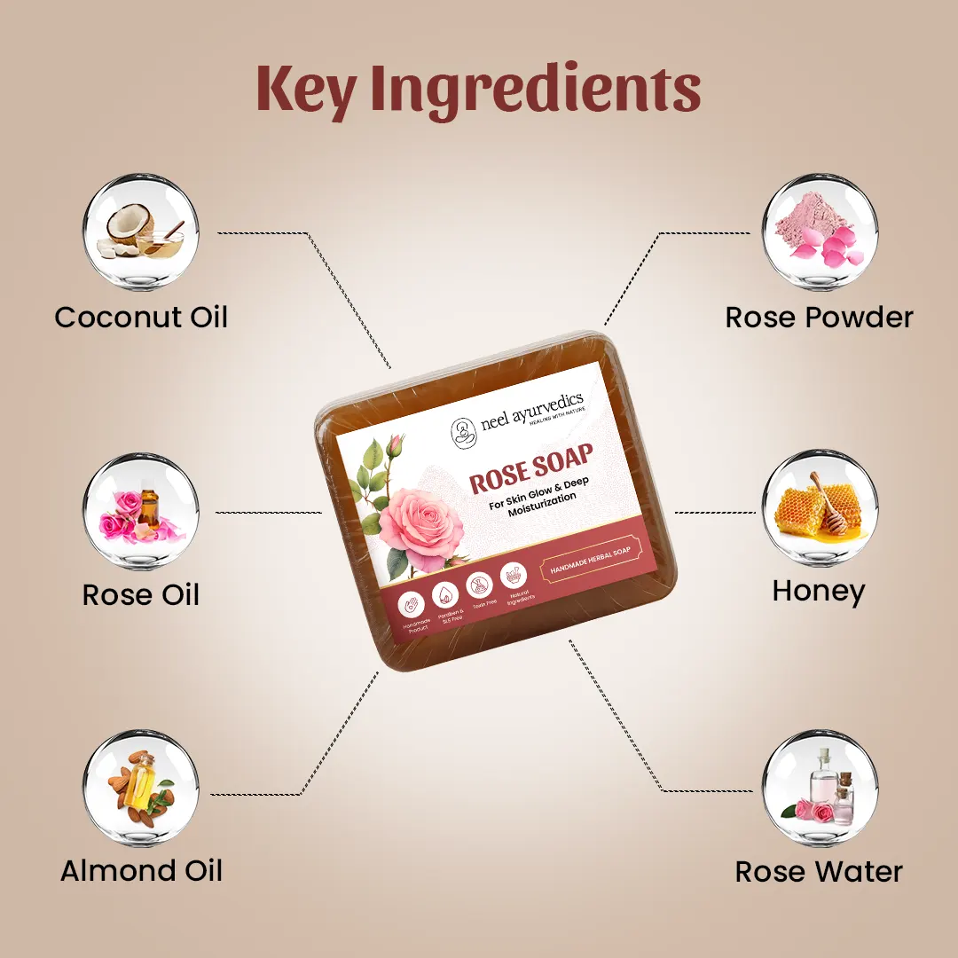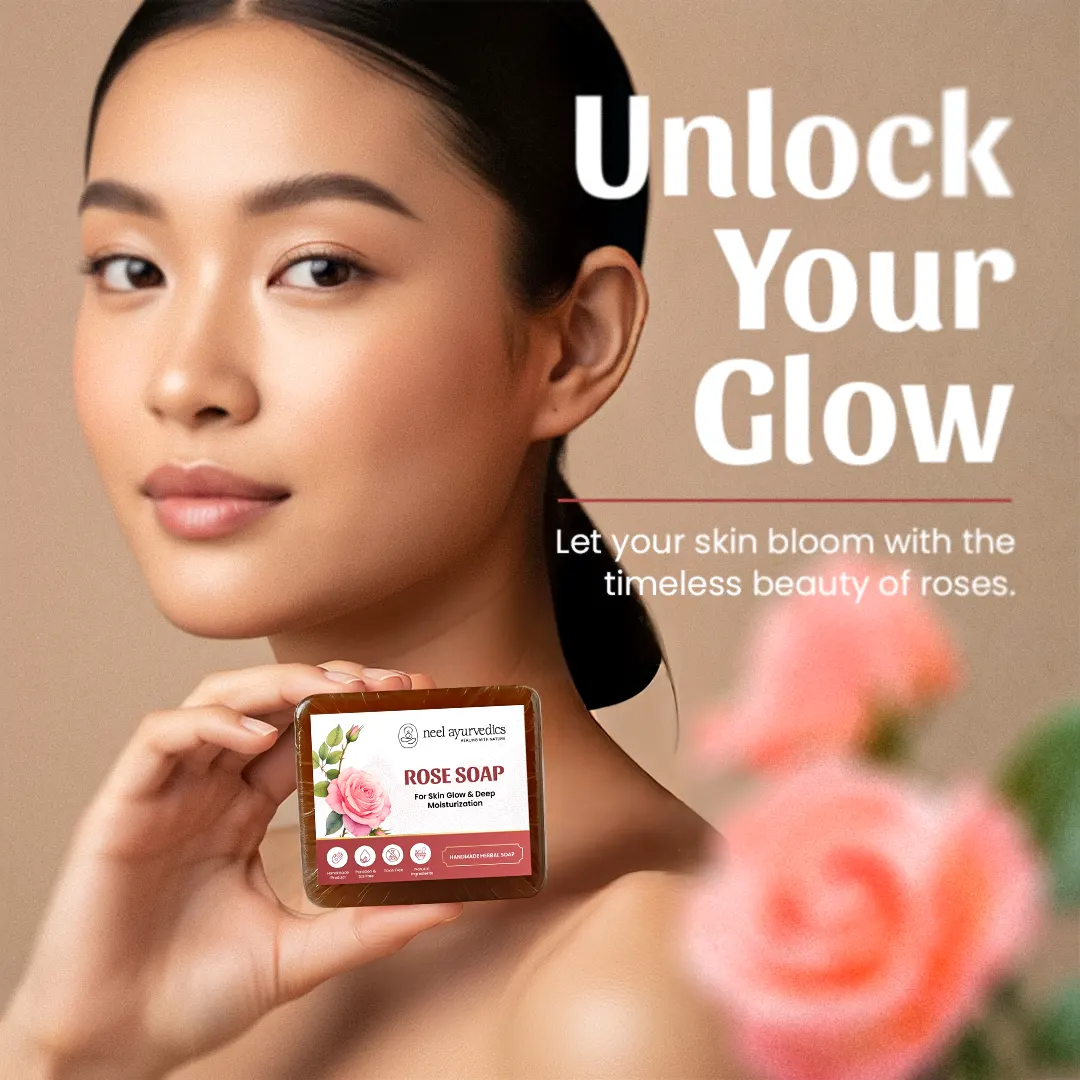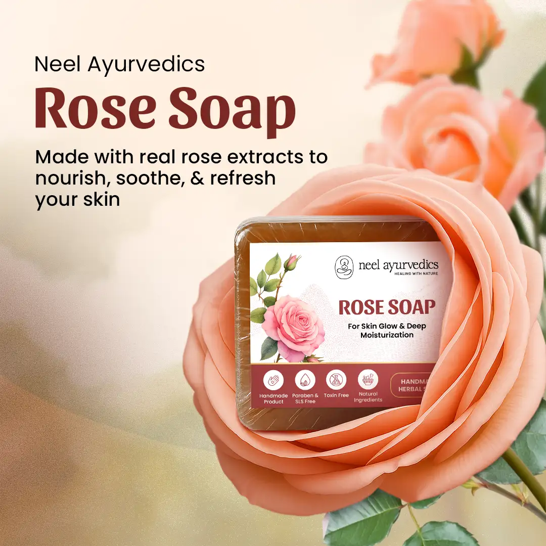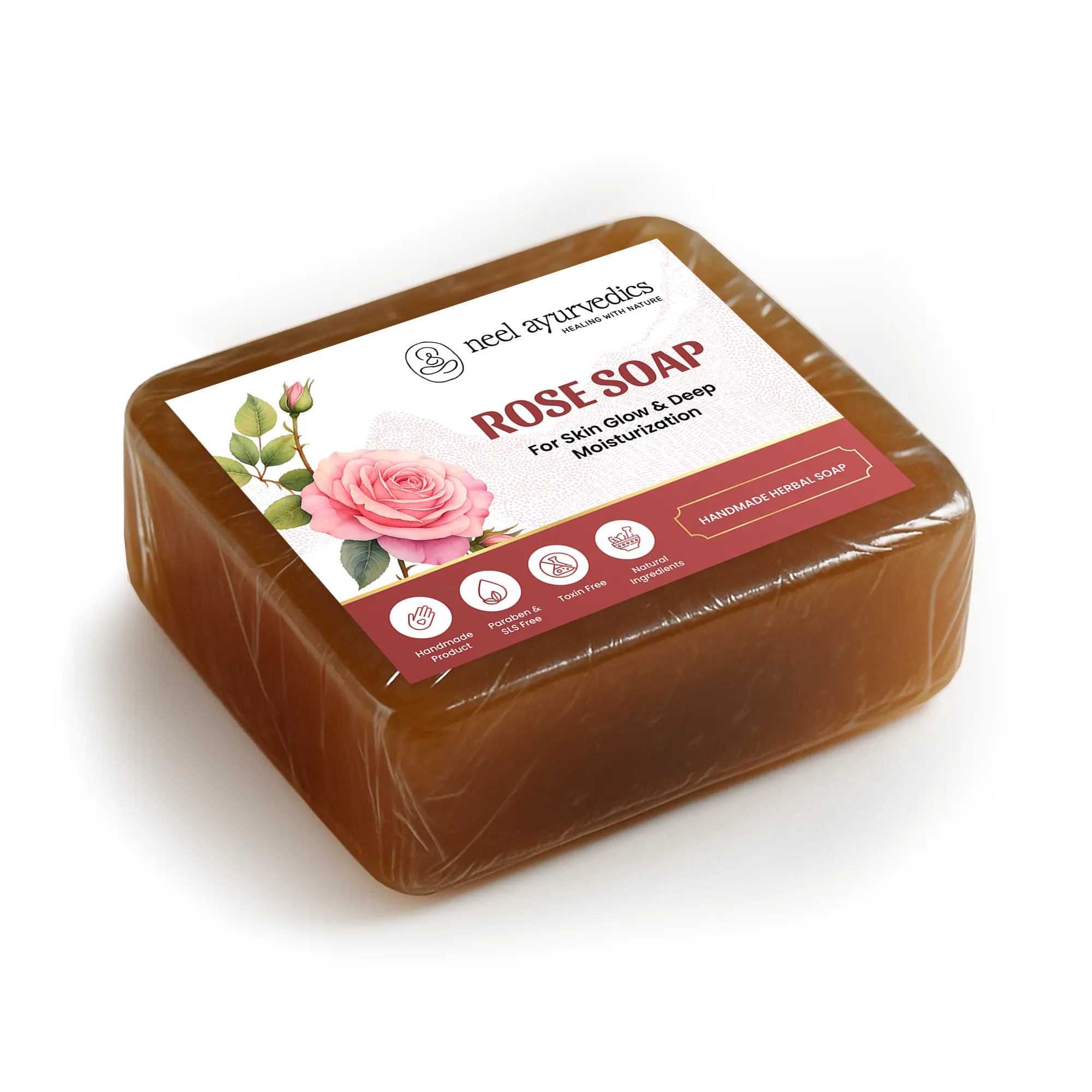 Treat your skin to daily luxury with Neel Ayurvedics Rose Soap, a beautifully crafted herbal soap infused with the finest pure rose powder, refreshing rose water, and nourishing rose oil.